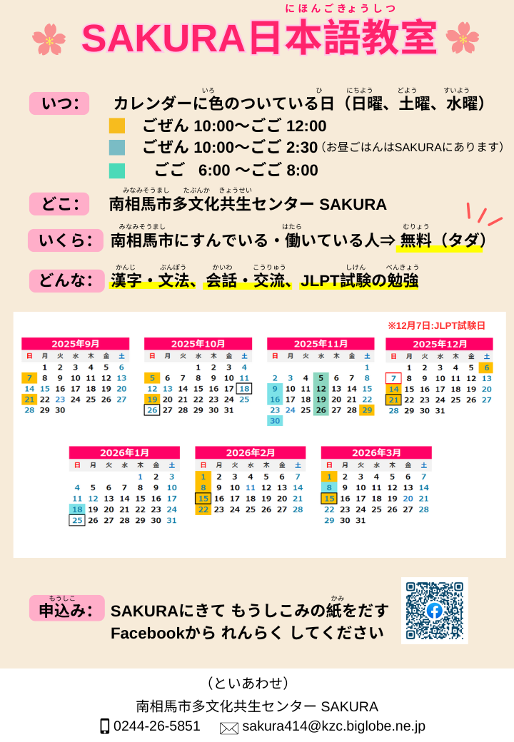 SAKURA日本語教室(9月~3月)のお知らせです。