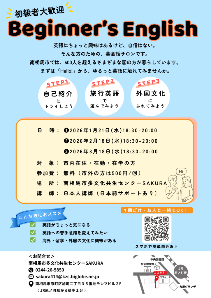 初級者向けの英会話サロン「Beginner’s English」を、1月~3月の期間限定で開催します!